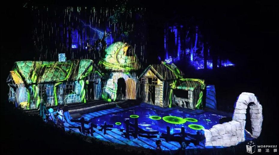 夜游动线总长保持1.4KM,沿动线分为13个故事节点,夜游时长约2.5H;以“四面奇缘”为主题,以自然山水为依托、以《爱情天梯》故事为蓝本、结合声光电装置、环境艺术、实景演艺、互动装置等元素,打造全国首个集观赏、体验、互动一体的光影主题乐园。