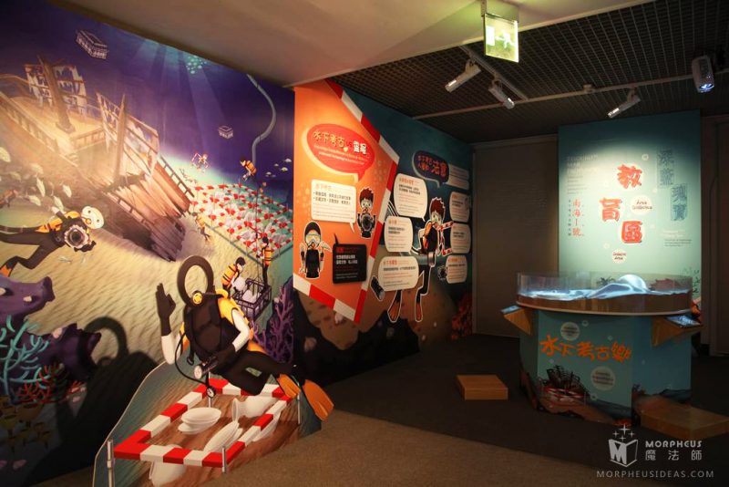 “水下考古乐”是一款实体投影的互动装置,参观者只需站在自己喜欢的瓷器前面,在平板电脑上选择瓷器表面的花纹底图,同时亦可加上自己的创意手绘。点击投影,电脑所生成的画面便会同步投影到实体瓷器上,扫描屏幕出现的二维码即可将图片保存到手机。参观者透过“水下考古乐”可以更好地增强对“南海1号”的认识,同时也让本次展览内容更加丰富,极具立体感。