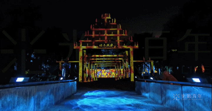 #龙巴门地面水波纹灯光照亮游客前行的路,水纹摇曳间,熠熠生辉。龙巴门采用精准投影,正门与侧门的横梁上,虫、鱼、鸟、兽,花纹通过光影,生动形象的展开。