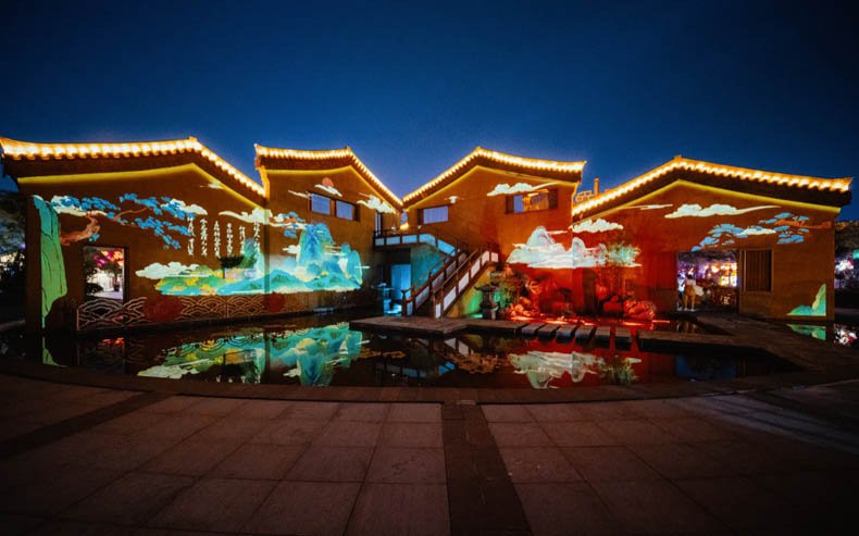 本次園區夜遊陞級,《禧牆》區域採用11臺RU75953雷射投影機打造而成,巧妙地利用原始建築牆面,投射春夏秋冬四季不同景致。每當入夜,園內原本簡約古樸的仿宋建築,在假山、水系、植物的映襯下,瞬間打造成一座360°開放式古典實景劇場。