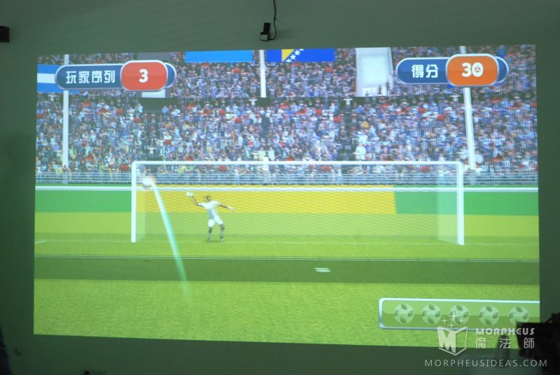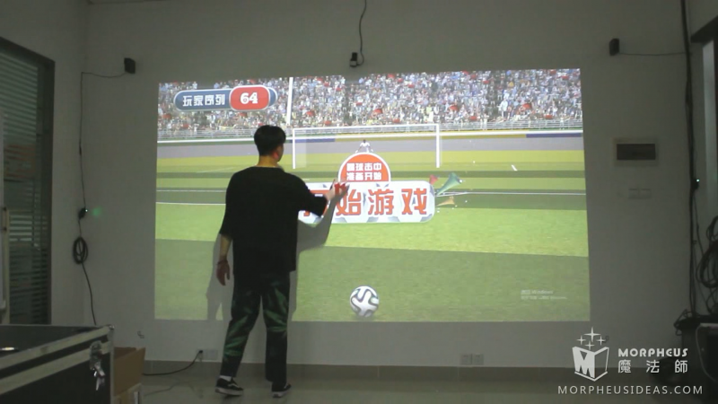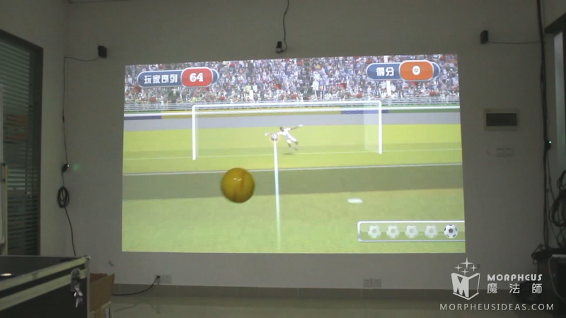 「足球小将之点球大战」这款游戏,魔法师采用虚实结合的游戏进行互动,藉助雷达技术和投影触屏等技术,参与者只需要将真实足球踢向墙面,系统捕捉到足球的运动轨迹后墙面内的足球会根据实际足球的运动轨迹飞向球门,而此时球门内的守门员也会做出判断迅速扑球,足球未被守门员接住即可得分。