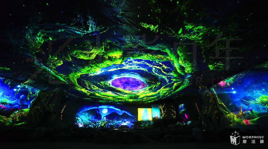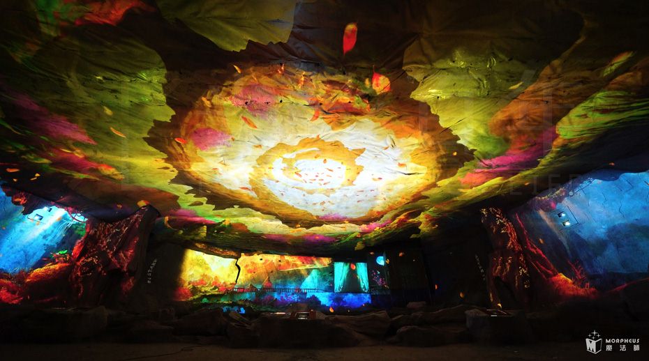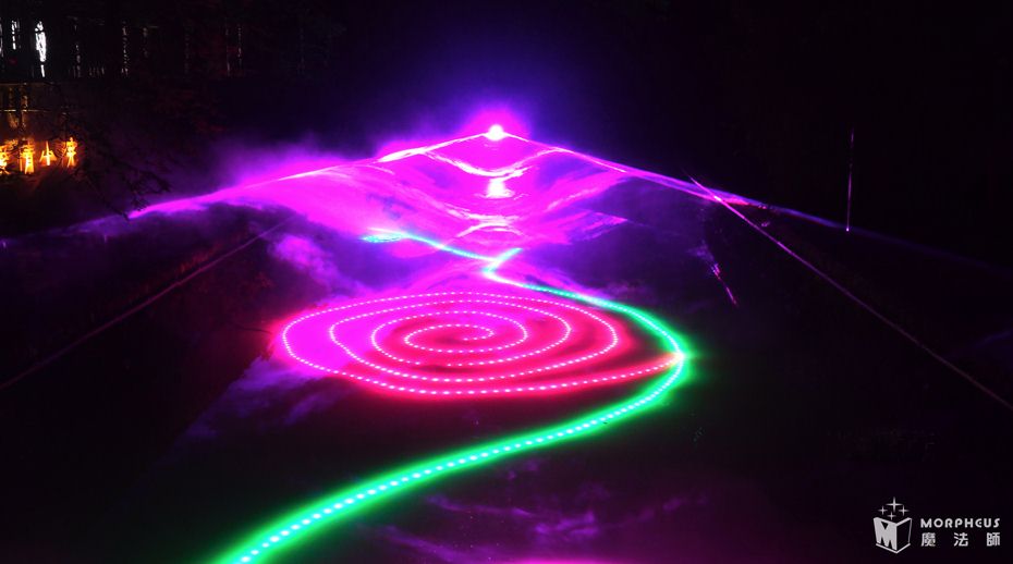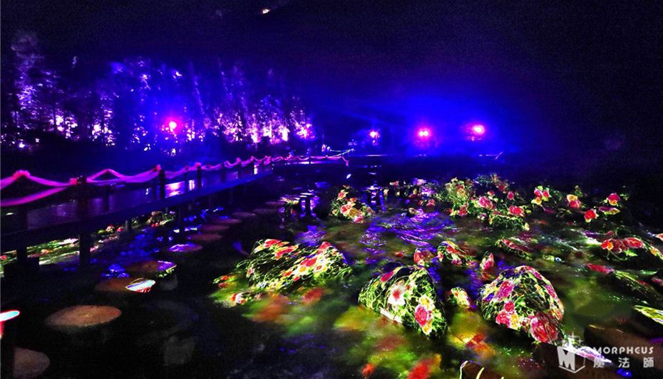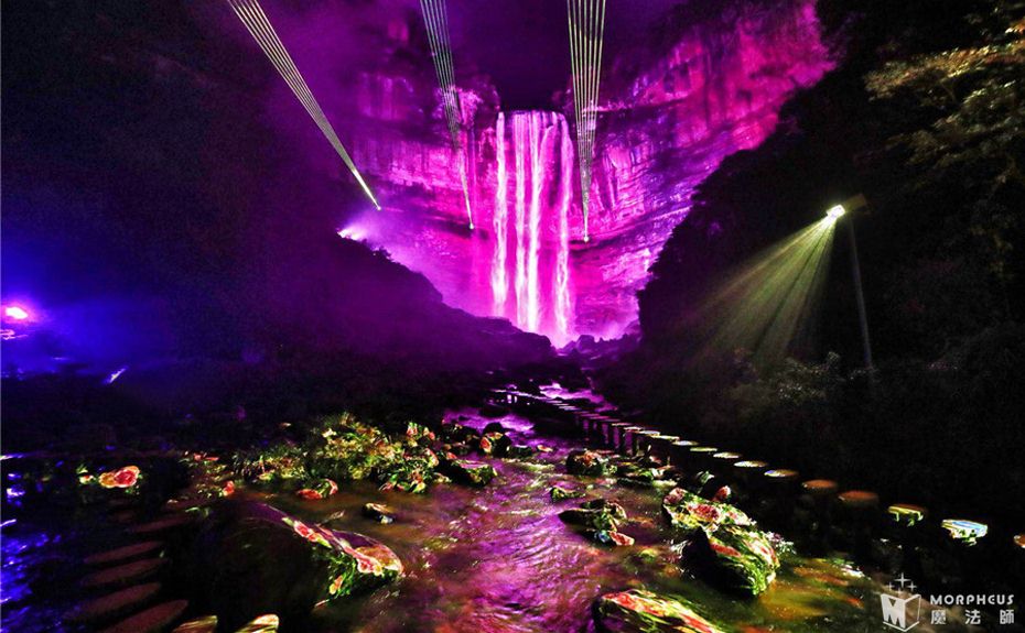 夜游动线总长保持1.4KM,沿动线分为13个故事节点,夜游时长约2.5H;以“四面奇缘”为主题,以自然山水为依托、以《爱情天梯》故事为蓝本、结合声光电装置、环境艺术、实景演艺、互动装置等元素,打造全国首个集观赏、体验、互动一体的光影主题乐园。