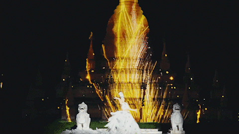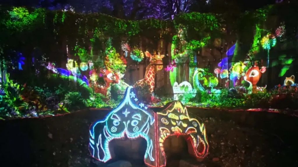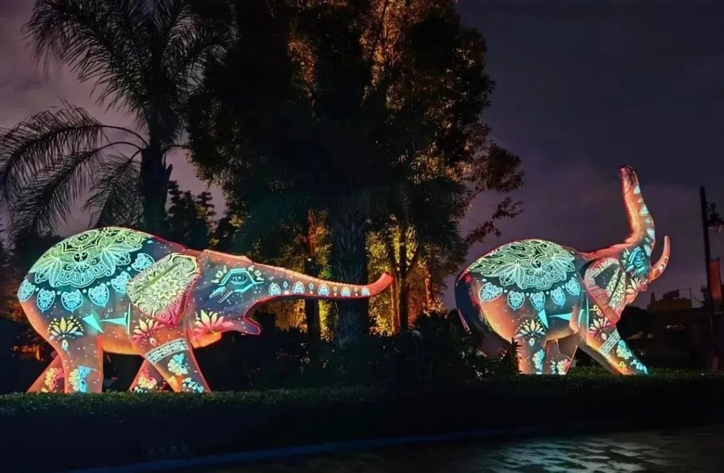 绚丽的投影披在白象雕塑上