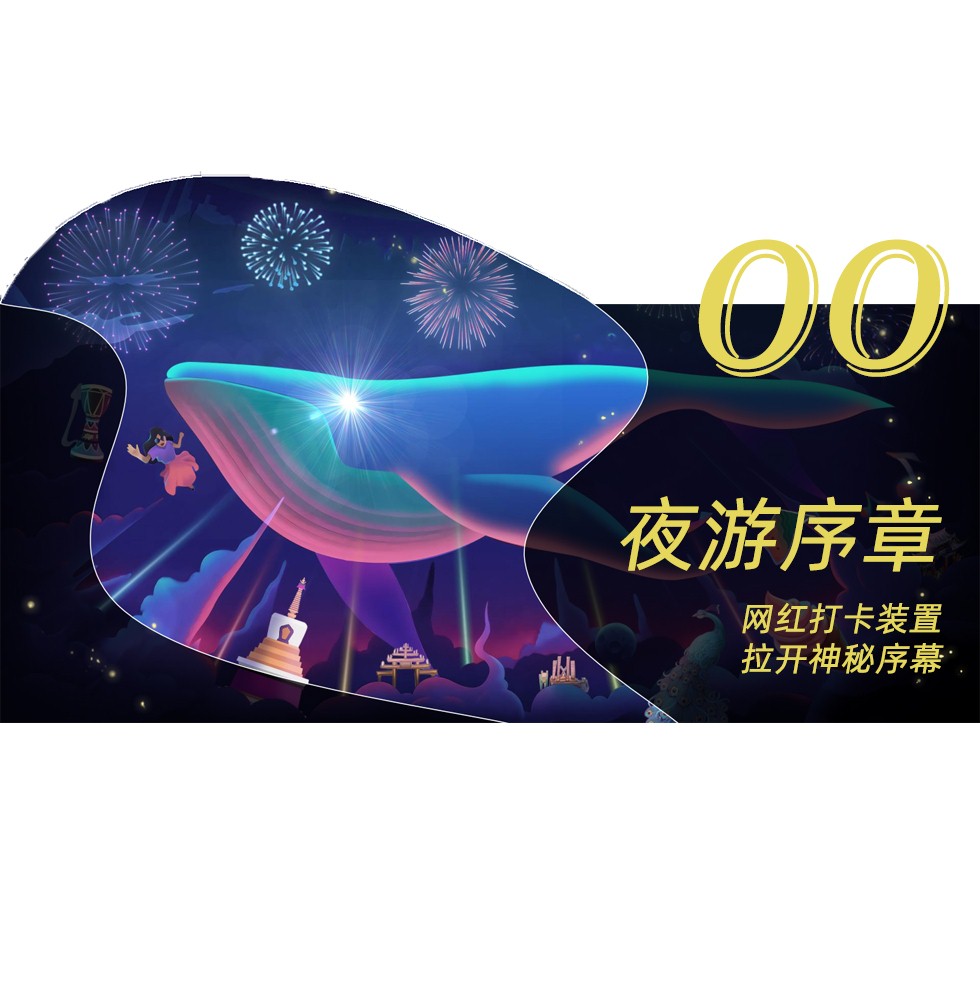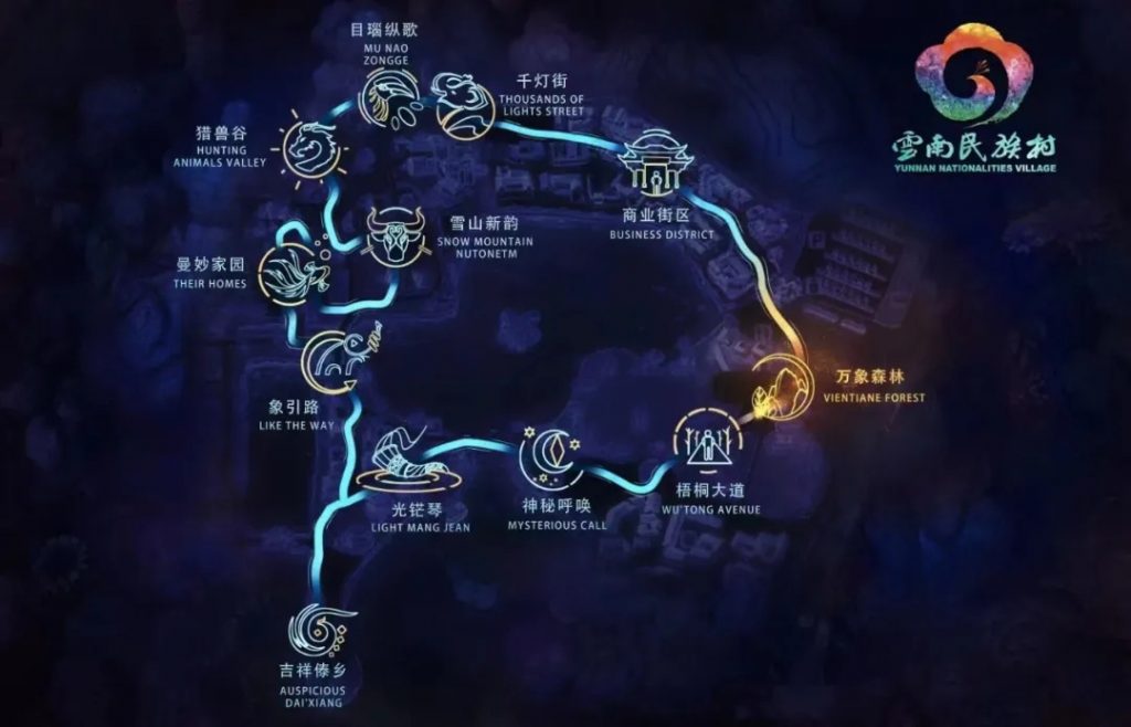 完整故事线体验由” 四场主题演绎大秀+八大互动体验节点+二十五个光影艺术节点 “组成,团队结合当地远古传说、特色民族部落文化及生物多样性特性,因地制宜、创意表达、创新体验。夜游路线长2.3公里 ,游玩时间预计90-120分钟。