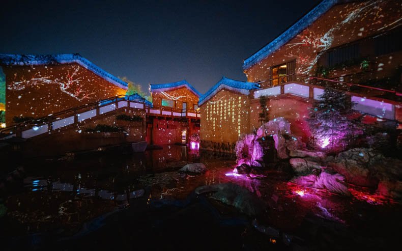 本次園區夜遊陞級,《禧牆》區域採用11臺RU75953雷射投影機打造而成,巧妙地利用原始建築牆面,投射春夏秋冬四季不同景致。每當入夜,園內原本簡約古樸的仿宋建築,在假山、水系、植物的映襯下,瞬間打造成一座360°開放式古典實景劇場。