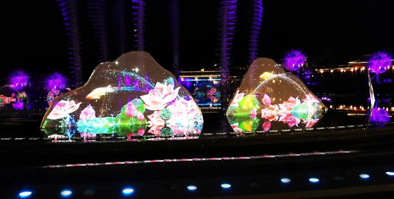 在整個項目中,負責了18米高的金屬鏤空動態雕塑投影,這種大型金屬活動結構投影國內罕見。另外還負責了十座特殊紗幕投影以及水下水臺投影,共提供了十餘臺3萬流明的雷射投影機,完成了特殊造型、特殊介質的挑戰性投影工作。