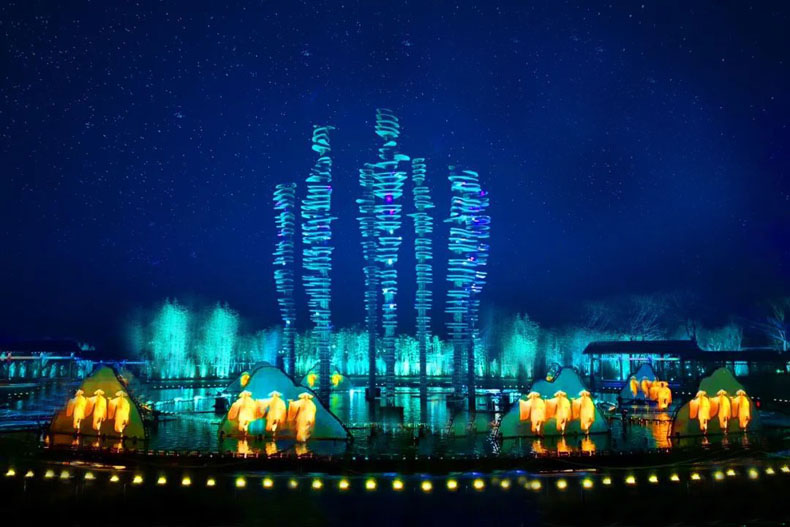 整個演出,通過水下舞臺裝置、全息數位影像屏、霧森、景觀環境藝術照明和高流明雷射投影五大視覺演繹手法,實現了舞臺演出與現實景觀的完美結合。