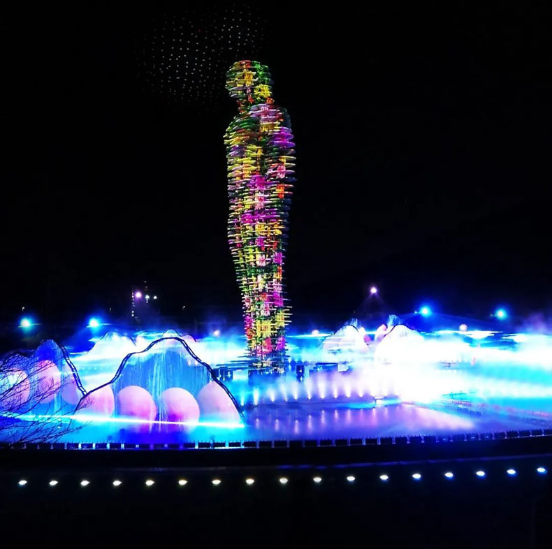 在雕塑所處的廣場上設定了噴泉和表演水臺,當演出者在水臺上表演時,水臺上的投影便會營造出“水上行走”的夢幻效果。