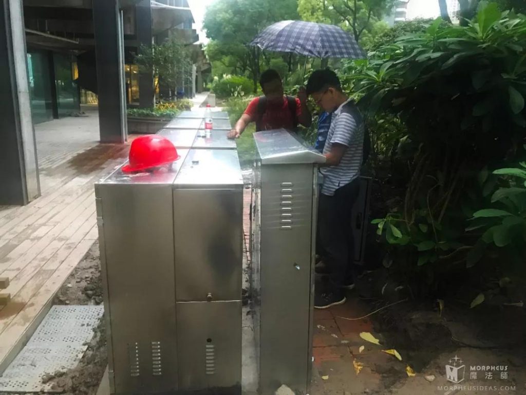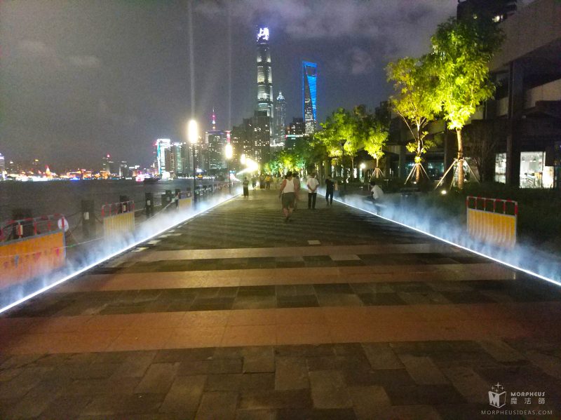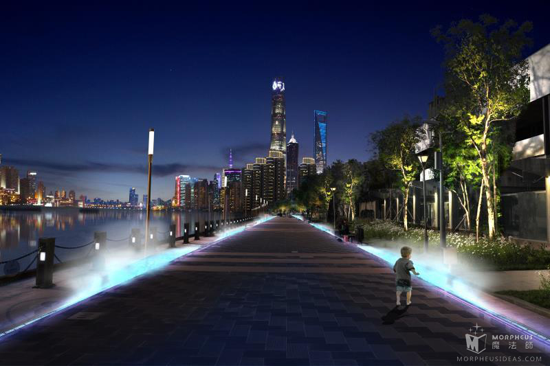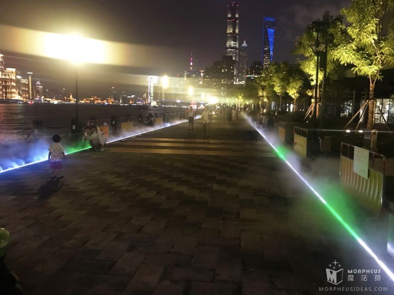 在老白渡濱江綠地人口最密集的路段中,我們在過道的兩旁分別設置了120米的LED洗牆燈,配備雙測70米雷達級聯檢測系統。當遊客經過過道時,檢測系統便開始收集數據,經過電腦的分析配置,再傳輸到照明系統,讓LED洗牆燈的燈光追隨著遊客的移動軌跡。再配合上噴霧降塵系統,仿如一條通往仙境的道路,流光溢彩,燦如星河。
